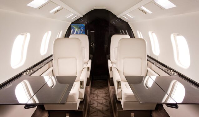 atrΗ διαμόρφωση της καμπίνας του ιδιωτικού τζετ Learjet 60 περιλαμβάνει άνετα καθίσματα για επτά επιβάτες και δύο μέλη του πληρώματος, με κλαμπ για τέσσερα άτομα, μια πολυθρόνα και έναν διθέσιο καναπέ.